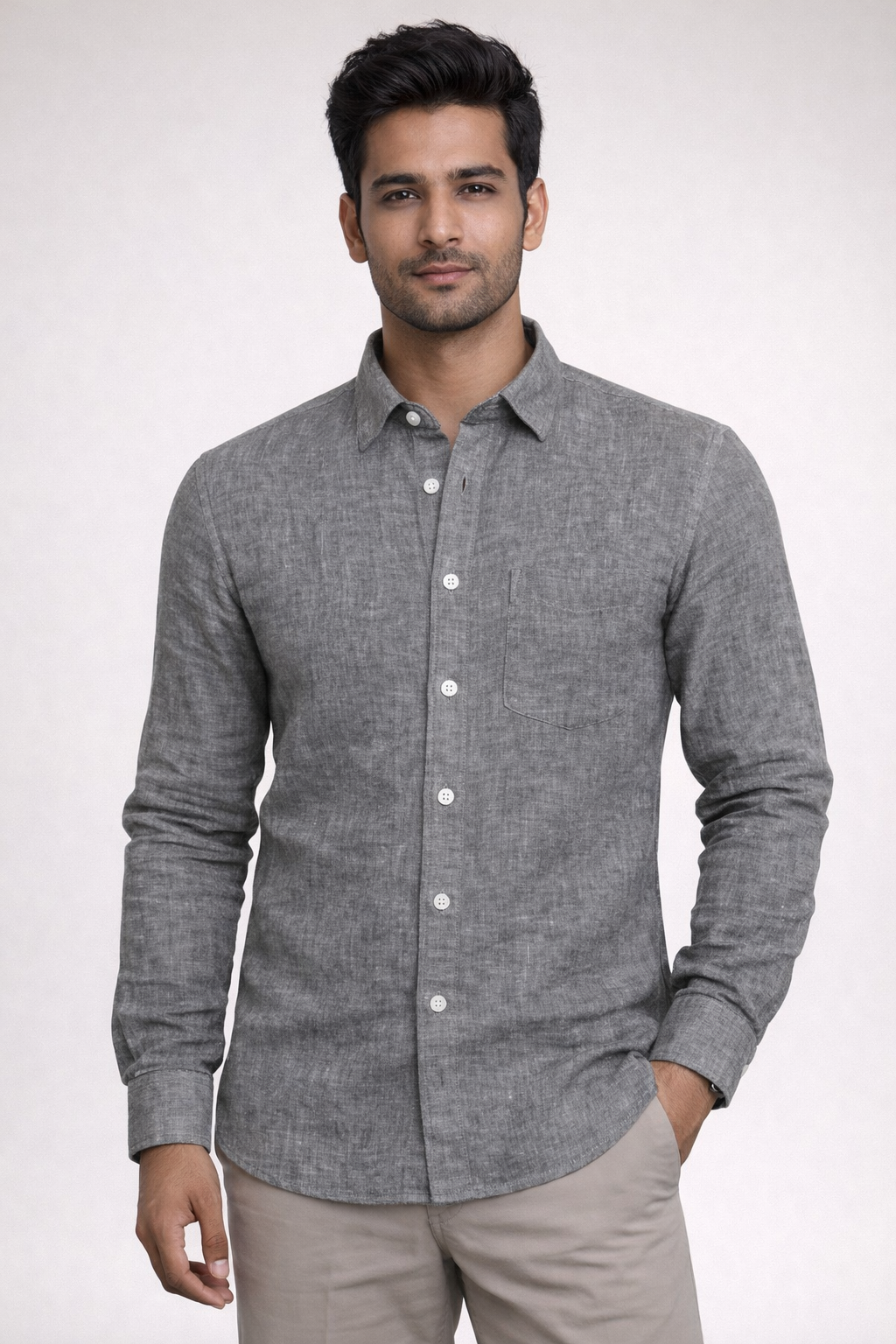 Redefine your wardrobe with the understated luxury of our 100% Pure Linen Shirt in Charcoal Grey. This versatile neutral offers a modern, sharp aesthetic that bridges the gap between casual comfort and executive style.