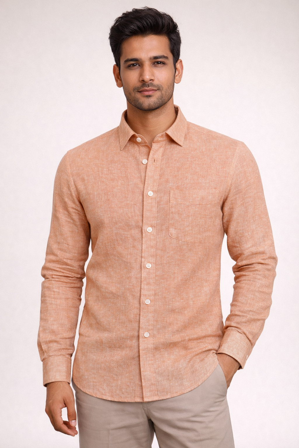The color of this shirt is a warm Peach or Apricot. It features a classic linen texture where soft orange-pink yarns are interwoven with white, creating a summery, sun-faded appearance.